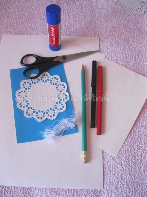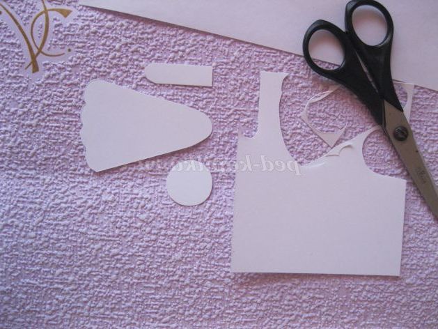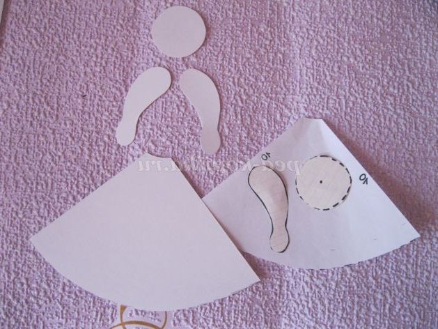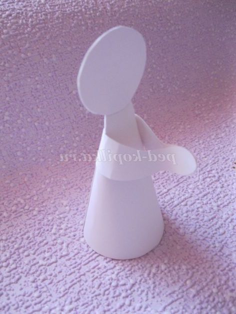 Етапи при роботі можна поміняти місцями: 7, 5, 6. Тоді тулуб буде виглядати акуратніше, хоча робота дещо ускладнюється (для дитини). Руки необхідно приклеїти так, щоб не потрапили під тулуб.
