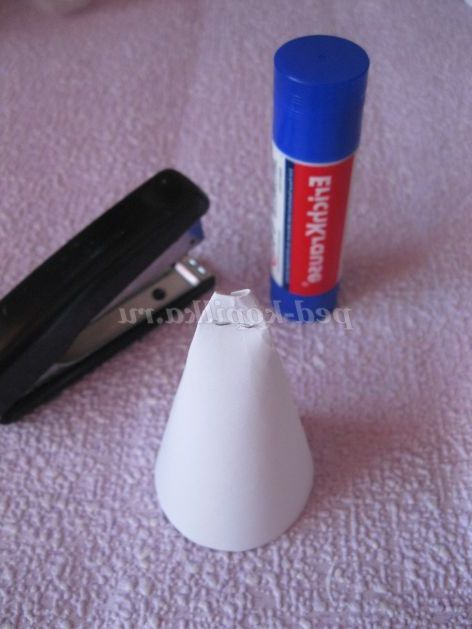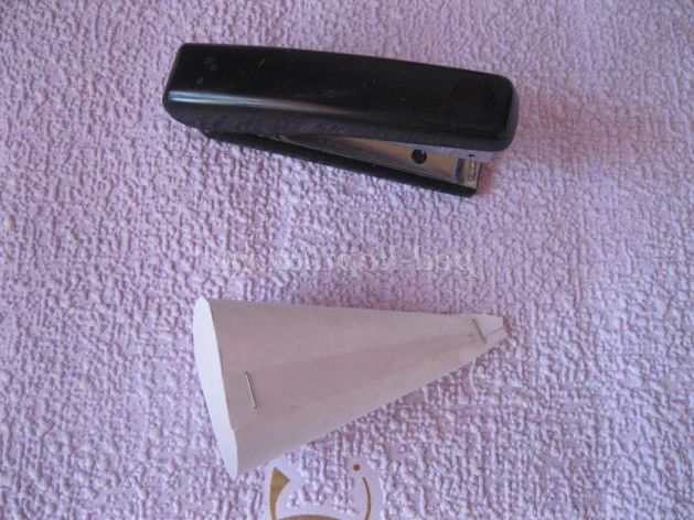 Деталь конуса склеюємо клеєм (намазуємо одну бічну частину по краю), для міцності фіксуємо степлером на початку і в кінці шва.