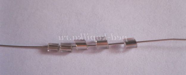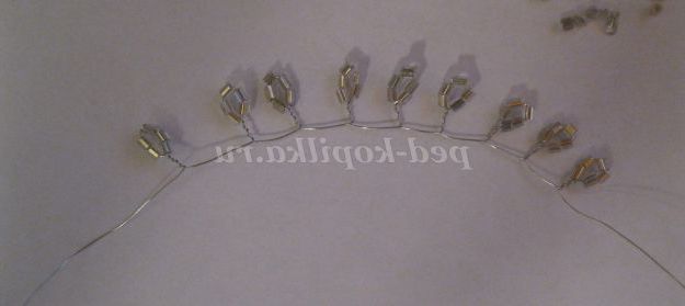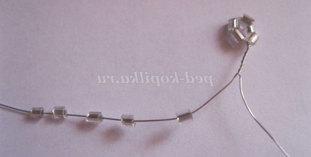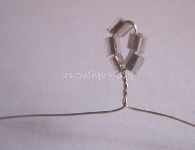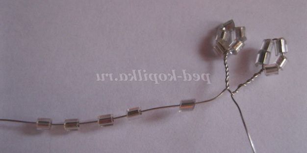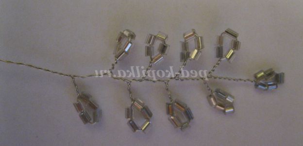 Нанизуємо стеклярус в кількості 5 штук. Формуємо петлю, перекручуючи дріт 5-8 разів на підставі петлі. Першу петлю формуємо в середині дроту.