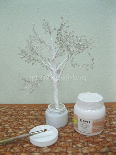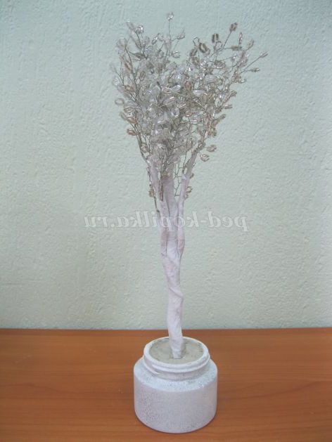 З'єднуємо підготовлені пучки зі стрижнем, формую стовбур дерева, обкручивая смужками паперу з клеєм ПВА. Залишаємо сохнути. Для більш надійної фіксації дерева в баночці нижній кінець дроту загинаємо (для дуже пружною дроту використовуємо плоскогубці).
