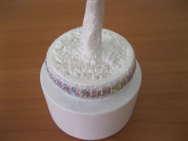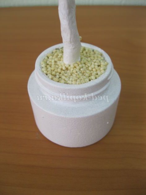 Стовбур дерева покриваємо білою акриловою грунтовкою. Поверхню біля стовбура дерева в баночці рясно змащуємо клеєм ПВА і засипаємо пшоном. Даємо висохнути.
