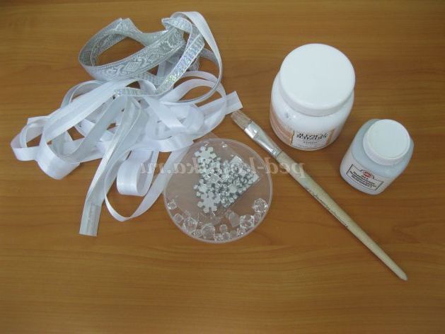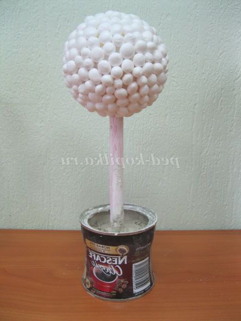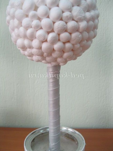 8. Баночку покриваємо акриловим лаком, даємо висохнути. Декоруємо обробної тасьмою. На паличку вгорі під кулю зав'язуємо атласну стрічку, тасьму. От і все! Наш зимовий топіари готовий!