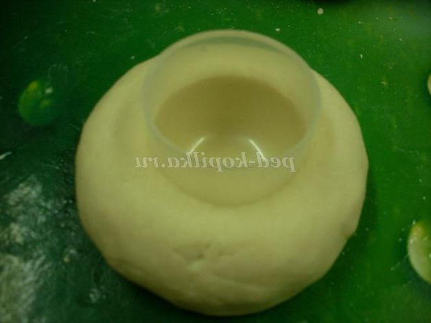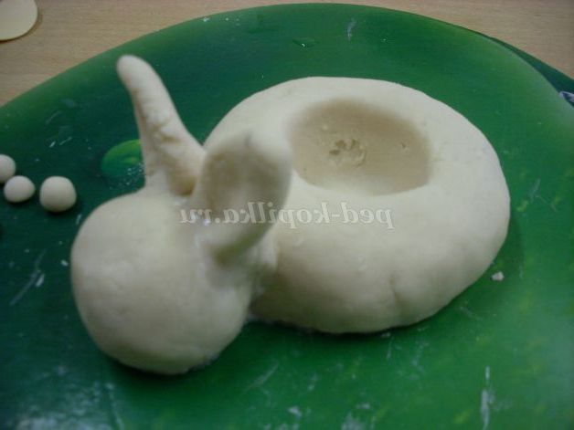 2. З великого шматка скачуємо кульку, кришечкою від лаку для волосся з допомогою натискання робимо поглиблення. Стискаючи куля з двох сторін, надаємо форму тіла (кришечку не витягуємо).