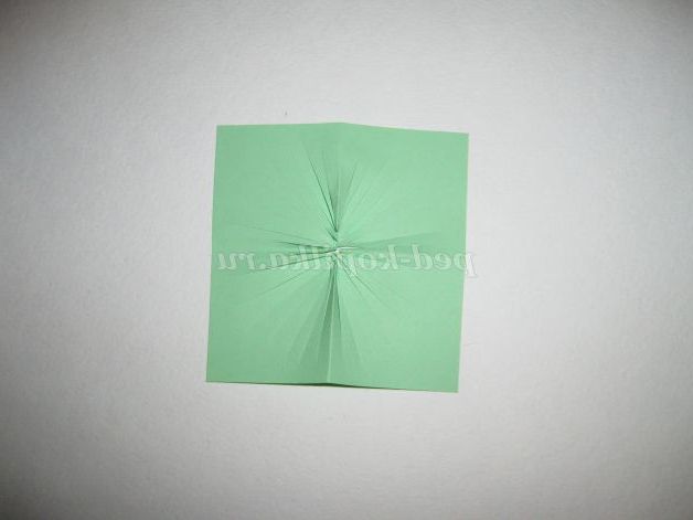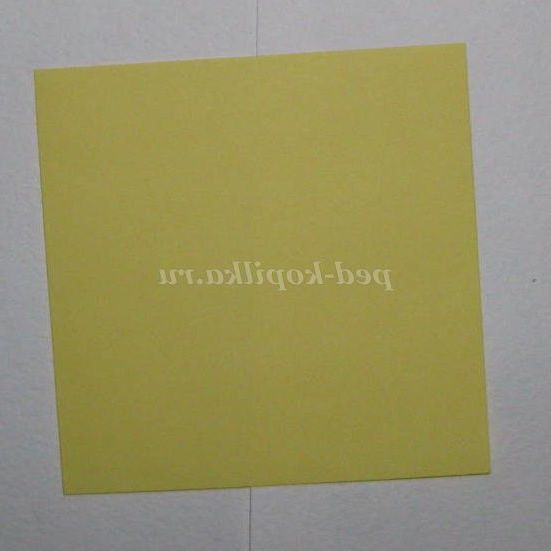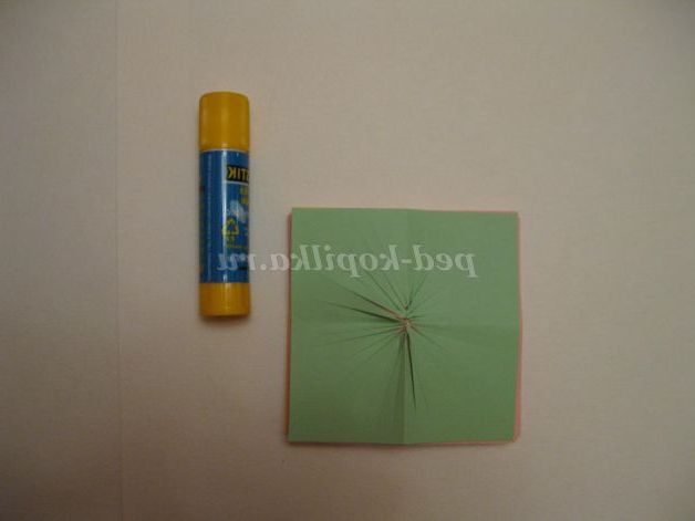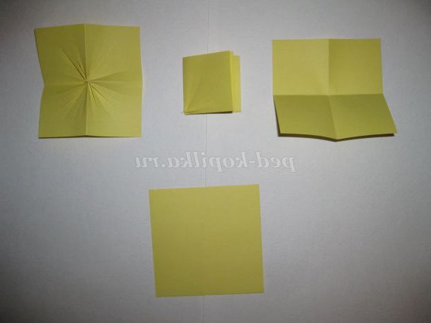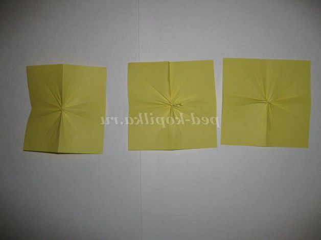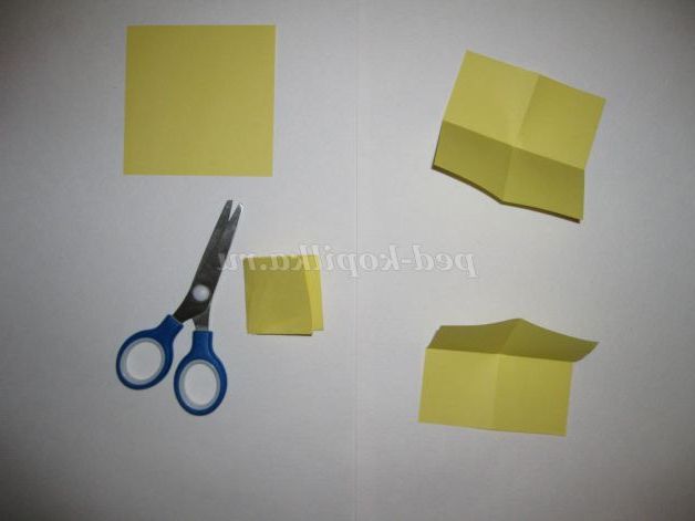 Візьмемо 3 квадрата жовтого кольору. Складемо у чотири шари і зробимо розрізи довжиною 2/3 від закритого кута.
