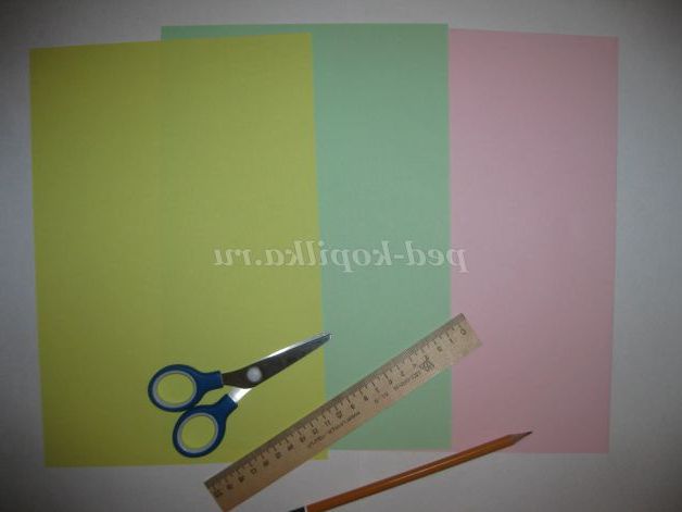 Беремо кілька рожевих аркушів паперу. Жовтий, зелений аркуш паперу.