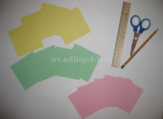 І вирізаємо 4 квадрата жовтого кольору ,розміром 9 см х 9 см, 12 квадратів рожевого кольору, розміром 9 см. на 9см, 4 зелених квадрата розміром 9см на 9см.