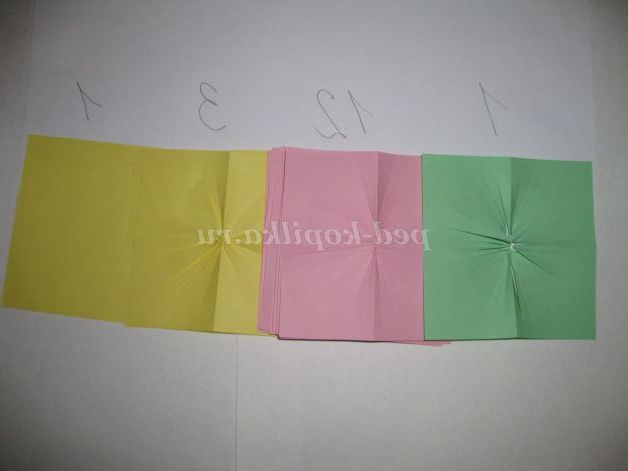 Перший зелений колір, потім рожевий, за ним жовтий, останній не розрізаний жовтий лист.