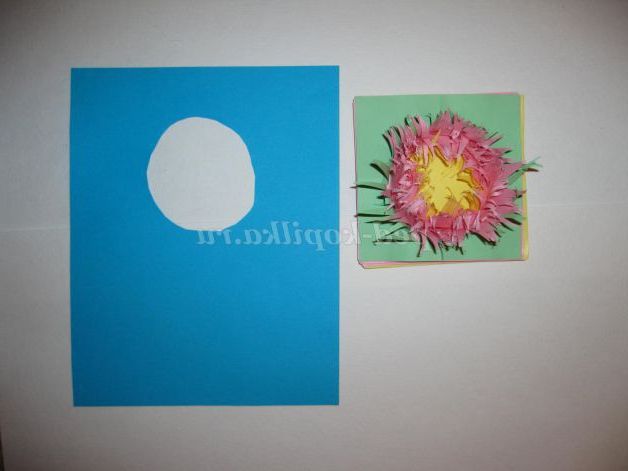 Акуратно розправимо пелюстки квітки. Зробимо круглий отвір діаметром близько 5 см в синьому картонному тлі, відступивши зверху 4см.