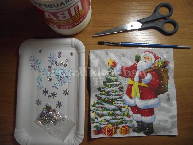 Матеріали: Паперова тарілочка , клей ПВА, пензлик, подвійна серветка з новорічним малюнком, паєтки.