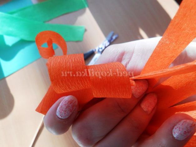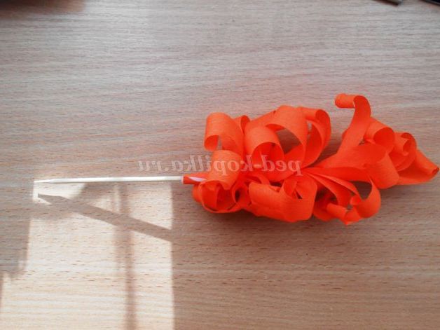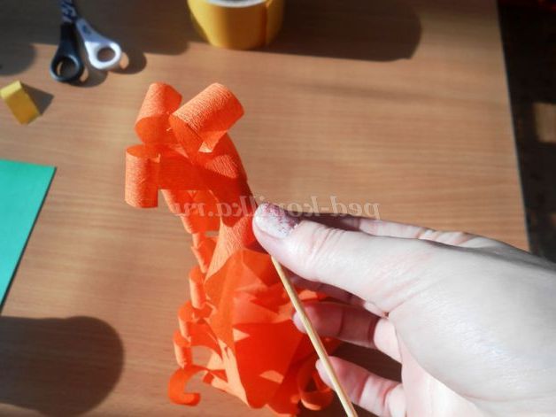 І починаємо акуратно намотувати нашу стрічку з завитків на шпажку, закріпивши верхівку квітки скотчем. Не забуваємо акуратно розправляти наші завиточки