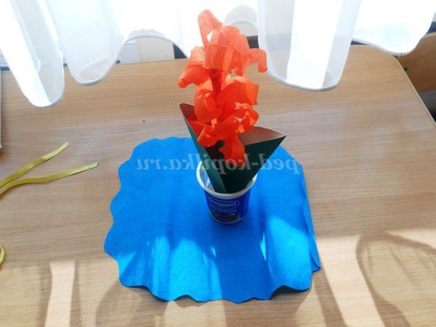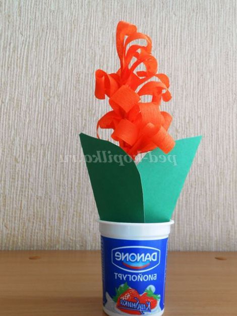Наш квітка готовий! Залишилося тільки зробити для нього вазу або підставку. Для цього можна взяти стаканчик з-під будь-якого йогурту. Отже, беремо стаканчик і пластилін. Розм'якшений пластилін кріпимо на дно стаканчика і вставляємо наш квітка в стаканчик з пластиліном (пластилін допомагає квітці втриматися на одному місці).
