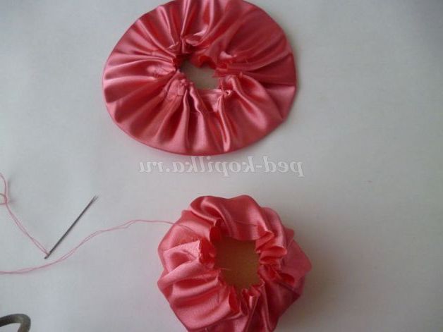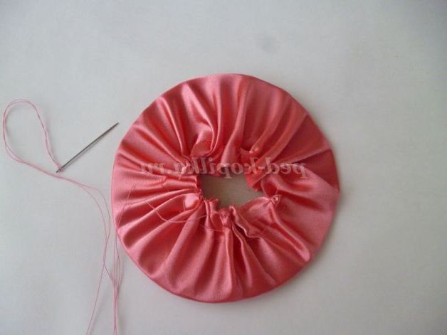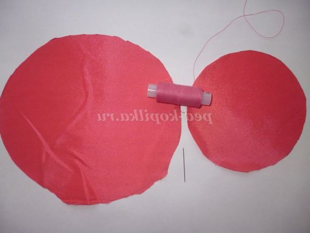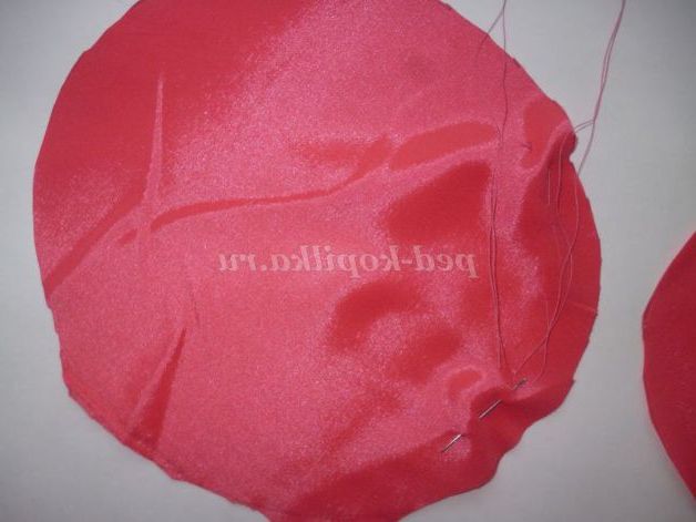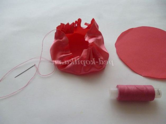 Готуємо верхівку шапочки. Так само присобираем край тканини на голку з ниткою. Вкладаємо спочатку наповнювач(я взяла шматочок паралону) стягаємо краю.
