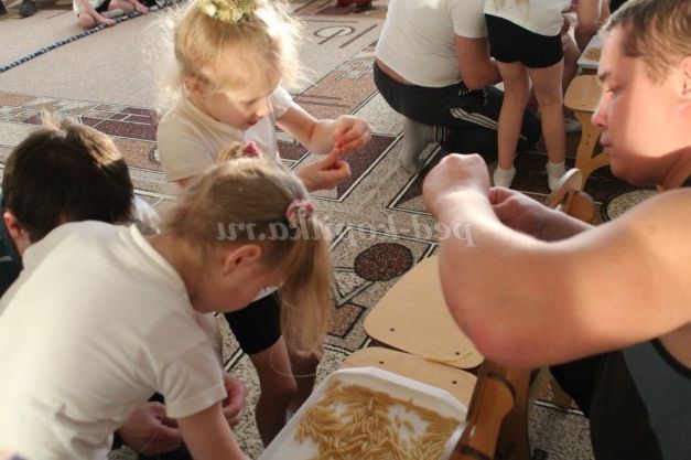 від кожної команди. Необхідно кожній парі за 1 хвилину нанизані на дротик як можна більше макаронів. Почали.
