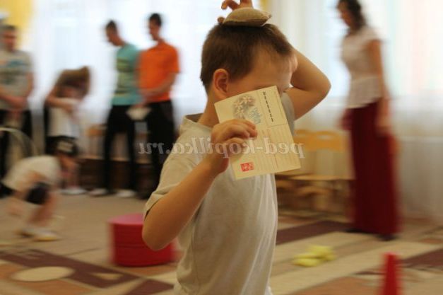 Гра доставка листів командиру. Через трасу перешкоди (кеглі, стільці, пуфи). Пронести конверт, який він повинен покласти на стіл командиру.