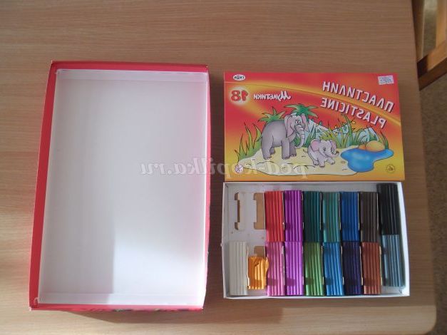 Матеріал: кольоровий пластилін і будь-яка коробка від цукерок(можна просто взяти картон). Фото 1.
