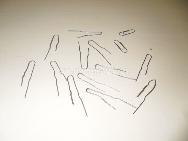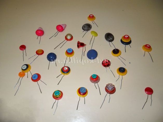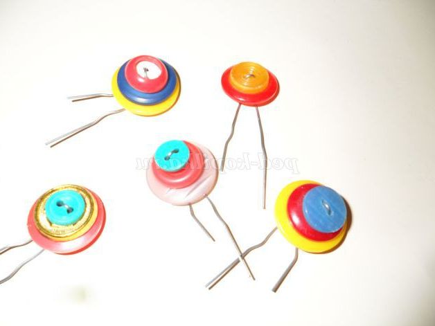 просмикнути в гудзикові дірочки, підігнути. На одну таку шпильку можна надіти 1 - 4 гудзики різного розміру і кольору.
