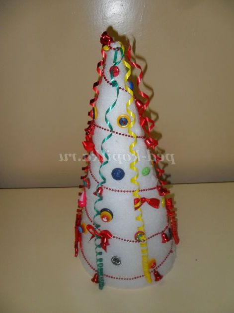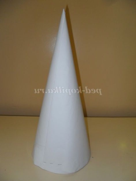 1.із щільного паперу згорнути конус, закріпити край клеєм і степлером. Знизу зрізати зайве і підрівняти так, щоб конус міг стояти.