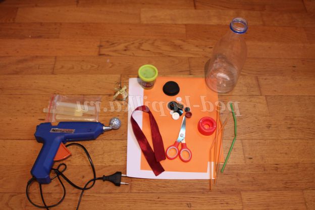 1. Для роботи вам знадобиться: прозора пластикова пляшка з кришкою, білий папір, кольоровий папір, клейовий пістолет, гудзики, стрічка червона або бордова 15 см, ножиці, шнурок, гуаш, пензель, трубочки.