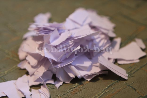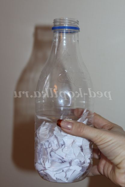 2. Беремо пластикову пляшку (можна з-під кефіру) Опускаємо її в гарячу воду, щоб відмочити всі етикетки. Пляшка повинна бути прозора. Рвемо руками білі аркуші паперу. Не варто робити це ножицями, з «махрами» виглядає цікавіше.