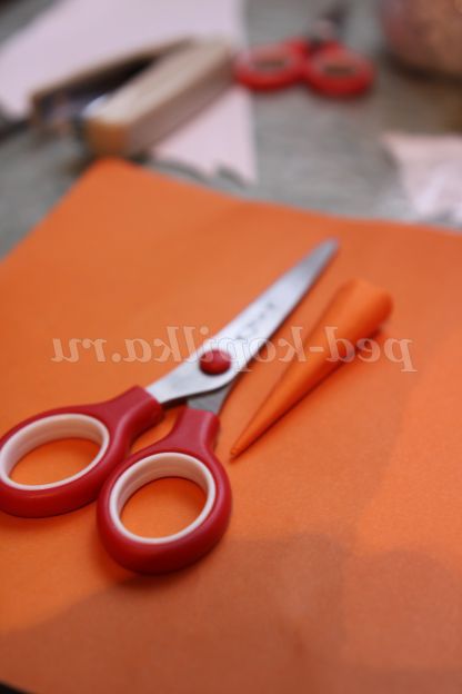 7. Ніс-морквина. Зробимо його з помаранчевої кольорового паперу. Конус. Приклеюємо його до пляшки клейовим пістолетом. Намалюйте на ньому чорні точки.