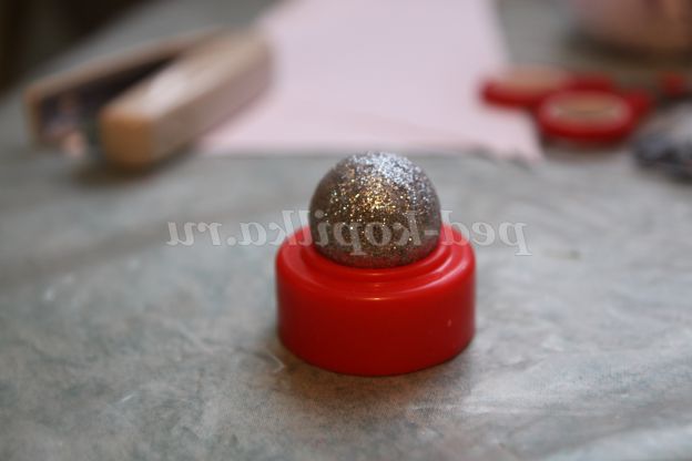 9. Для шапки ми використовували колесо від «зламаною машини» і ялинкова кулька. Ялинкова кулька приклеїли зверху. Можна змайструвати конус або використовувати кришку від пляшки.