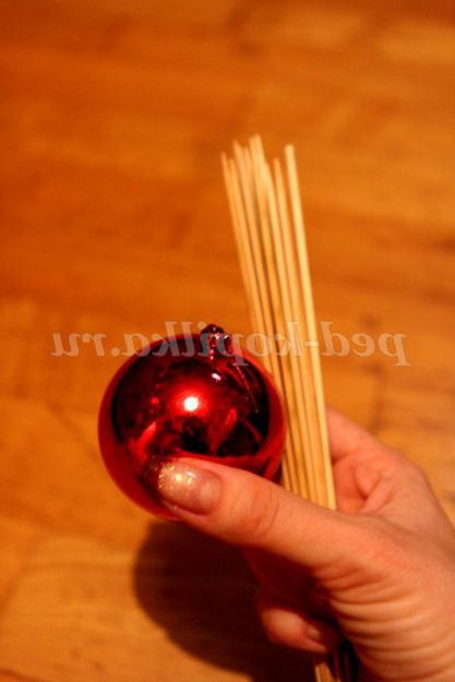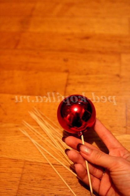 У ялинкових куль знімаємо кріплення. І з допомогою клейового пістолета кріпимо його на шпажку.