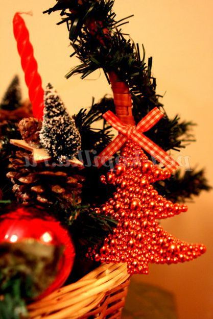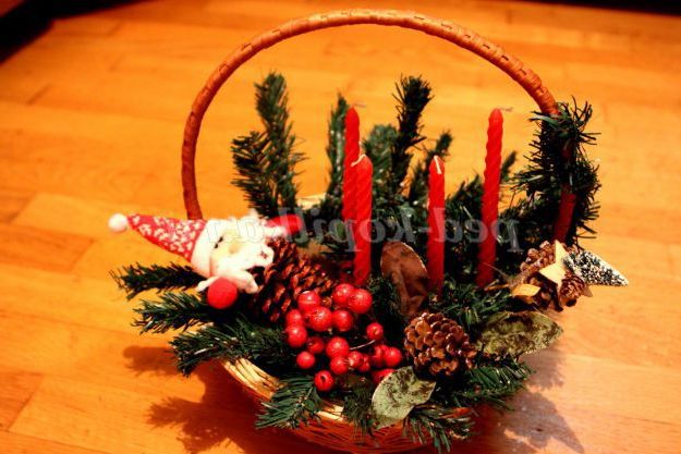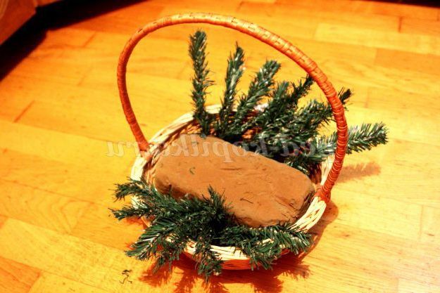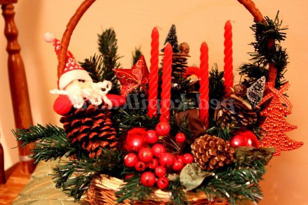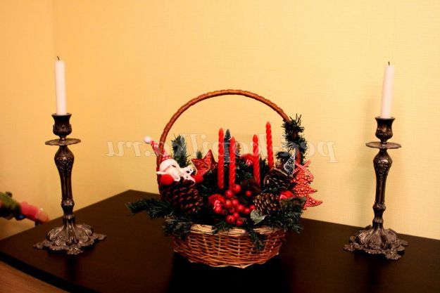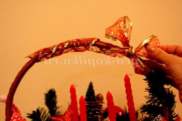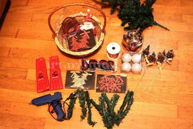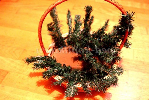 Вам знадобитися: корзинка, сухий оазис, штучні гілки хвої ялини або живі гілки, свічки, клейовий пістолет, ялинкові прикраси, стрічка, шпажки або зубочистки, скотч