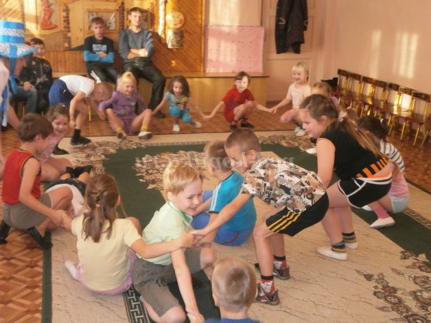 Гра "На болоті"(двоє дітей в обручі, на одній нозі повинні виштовхнути один одного, хто залишається, той переможець)