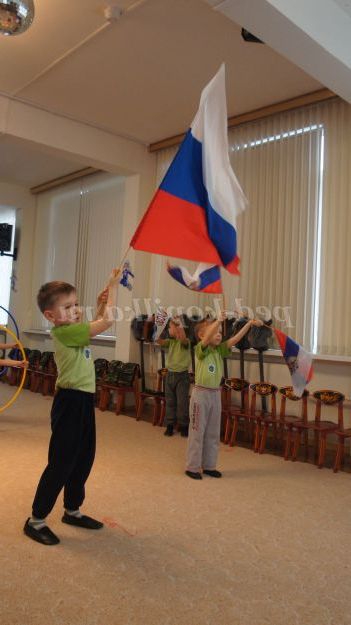 Під музику «Олімпійські кільця» діти вносять 5 олімпійських кілець, олімпійські символи, прапорці різних країн, прапори Росії, олімпійський факел. Дитина з олімпійським факелом «запалює» модель олімпійського вогню.