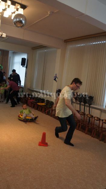 Дитина сідає на санчата, батько за мотузку щастить санки навколо конуса, повертається назад і передає естафету наступному учаснику.