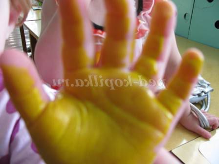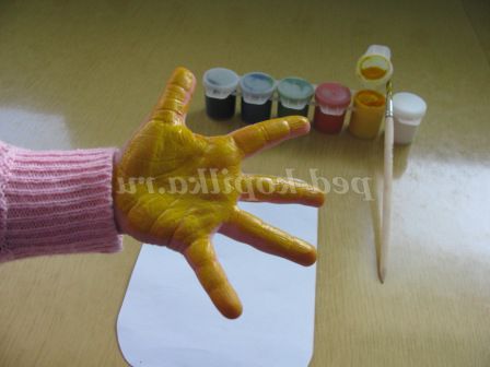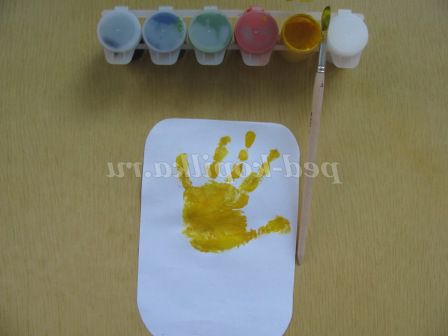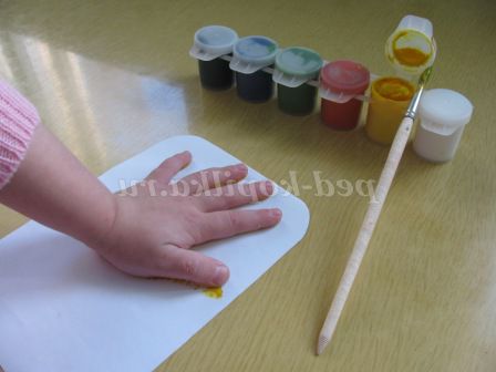 Наносимо гуаш на руку дитини і робимо відбиток долоньки на білій основі.
