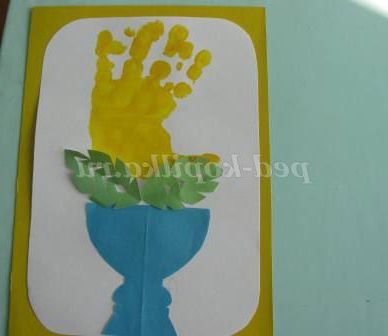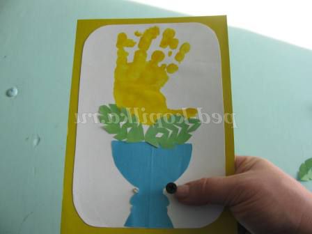Мета: навчити дітей робити відбитки долоньок у вигляді квітки, симетричним способом вирізування виготовляти вазочку і листочки, оформляти композицію, виховувати чуйність і доброзичливість до близьких.