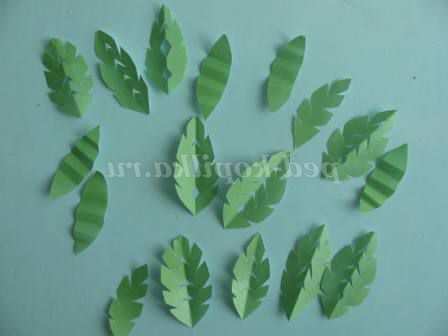 Прямокутний аркуш зеленого кольору розрізаємо навпіл - відрізаємо, ще раз проробляємо таку ж операцію, малюємо половинку аркуша, вирізаємо не розгинаючи, по лінії згину робимо вирізи зубці.