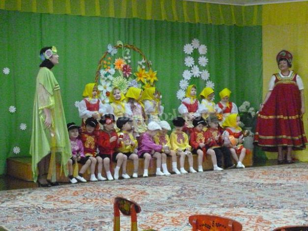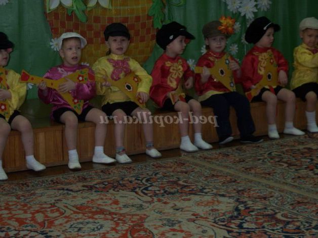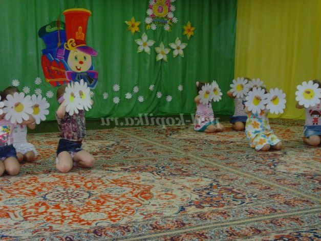 "Цветики, цветики, зберемо букетики. волошки, ромашки, рожеві кашки". Діти з різнокольоровими квітами бігають під музику. По закінченні музики збирають букети з однакових кольорів.