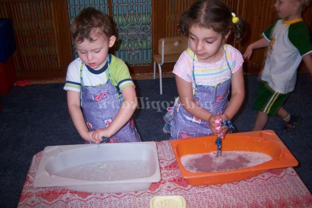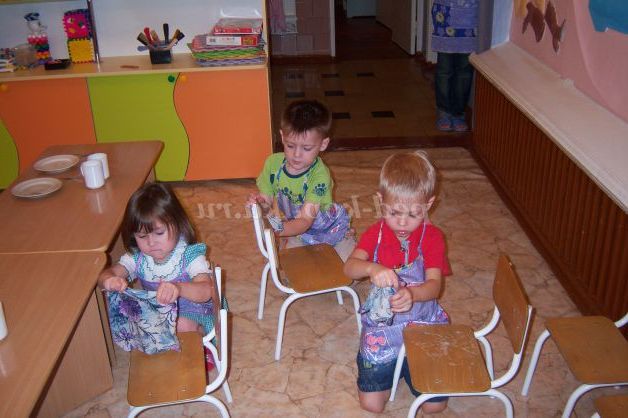 Завдання: виховувати інтерес до праці; вчити дітей акуратно працювати з водою, закріплювати вміння прати (намилювати, прати руками, ретельно промити, віджимати і розвішувати)