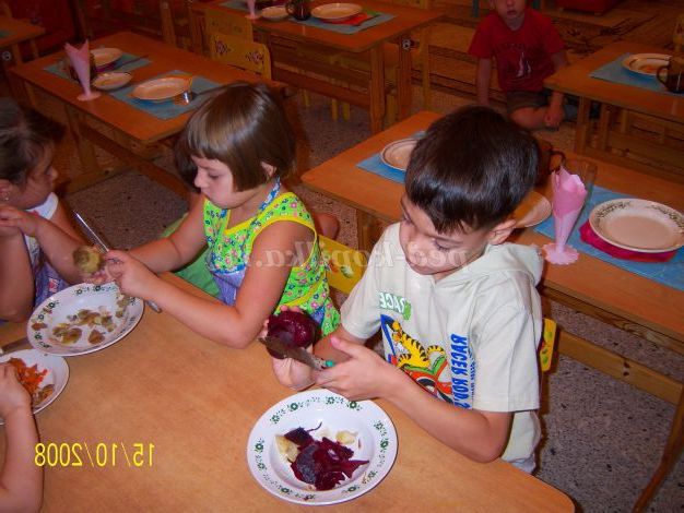 Чистимо варені овочі для страв,які підлягають термічній обробці Завдання: вчити дітей чистити овочі, працювати столовим ножем