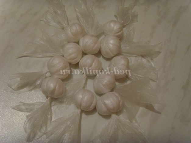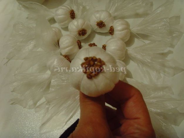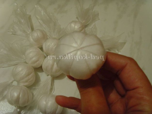 Роблю часник з пакувальних пакетів, розрізавши мішок навпіл, у мене виходить 4 квадрата з мішка. Беру вату, формую потрібний розмір ватного кульки і кладу в квадратик з мішка, туго обв'язують нитками.