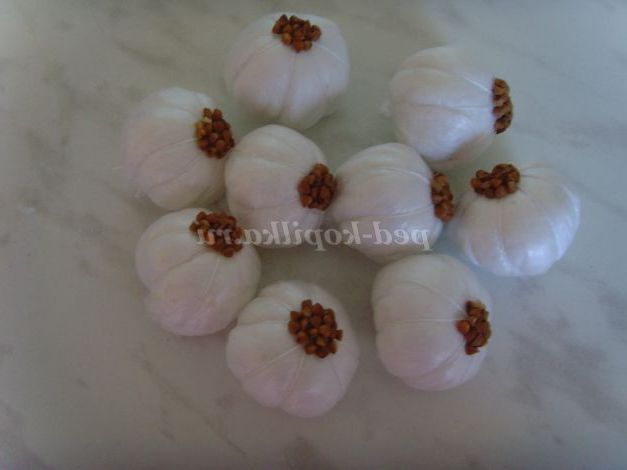 Зверху приклеюю гречану крупу і обрізаю хвостики у часнику.