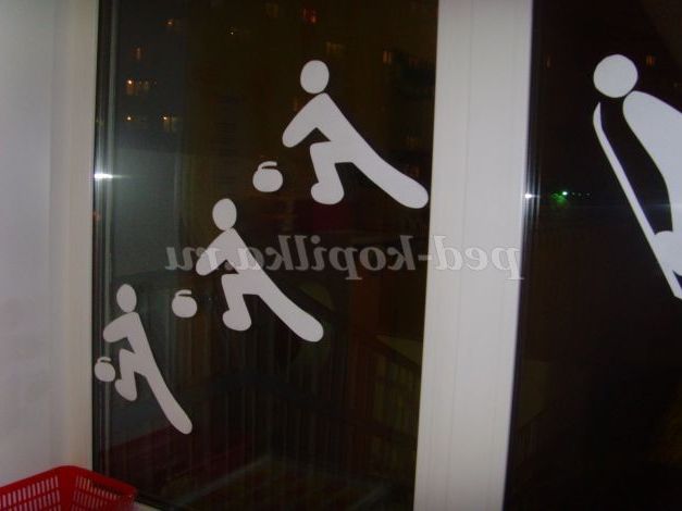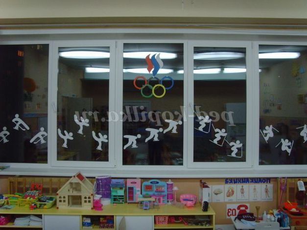 На вікнах в групі я намалювала піктограми 7 зимових видів спорту. Біатлон, бобслей, керлінг, хокей на льоду, санний спорт, ковзанярський спорт, лижний спорт.