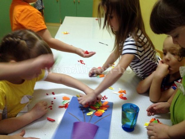 А тепер кожен з вас зможе приклеїти свої листочки до гілочок, потім ми приклеїмо ягідки горобини. Пам'ятайте, що ми працюємо всі разом і дружно, тому допомагаємо один одному, якщо це необхідно.