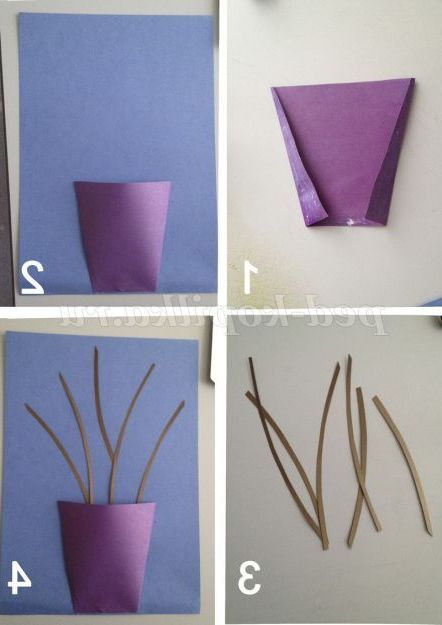 На основу з картону синього кольору ми приклеюємо вазу, виконану з листа бузкового кольору. Ваза виконана з квадрата зі стороною 10см. Мені хотілося, щоб ваза мала обсяг, тому я загнула кути квадрата в нижній його частині на 3 см з кожного краю навскоси. (на фото 1,2 кадр)