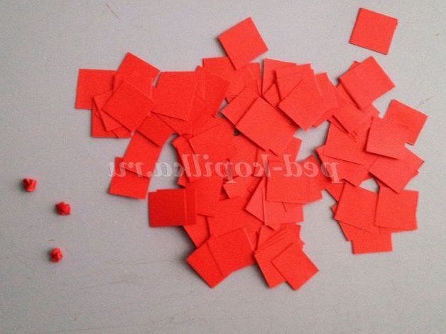 А тепер давайте зробимо ягідки до нашої горобинки. Візьмемо маленький червоний квадратик. Його необхідно в пальчиках акуратно зім'яти в грудочку. Сминаем, здавлюючи папір зі всіх сторін. Можна цей грудочку покатати в долоньках, щоб надати йому круглу форму.