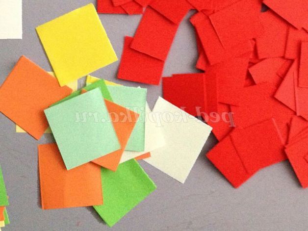 Для листочків і ягід теж необхідно підготувати достатню кількість квадратів. Для листочків ми використовуємо кольоровий папір жовтого, червоного, помаранчевого і зеленого відтінків. Квадрати нарізаємо зі стороною 3см. Для ягід використовуємо папір червоного відтінку, квадрати нарізаємо зі стороною 2см.
