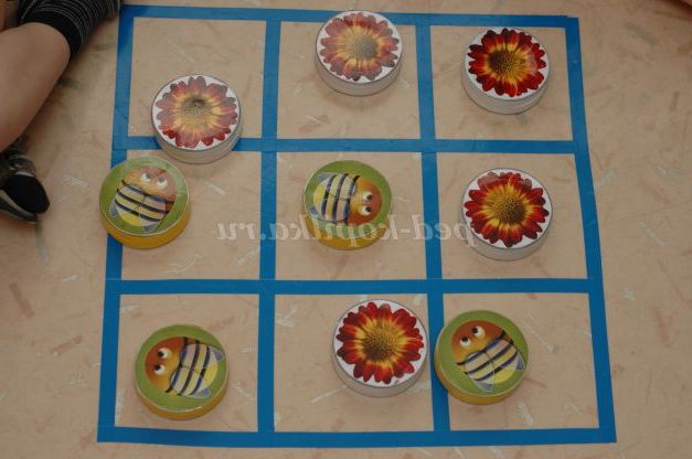 У нас вийшло два ігрових поля, тому комплектів фішок теж два. Зроблені вони з пластикових кришок на трилітрові банки. Кожна фішка складається з двох кришок. Всередину ми поклали пластиліну для вагомості фішки, можна нутрощі заповнити папером, щоб кришки не проминались. Місце стикування і всі ребро обмотали все тієї ж ізолентою. На верх і низ фішки зробили картинки квіточок, бджілок, божих корівок. Ребетня грає із задоволенням, головне, навчити їх, як це робити!
