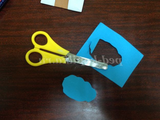 З невеликого листа блакитного кольору вирізаємо овал з хвилястими краями - це буде калюжа від растаявшей хатинки лисиці.