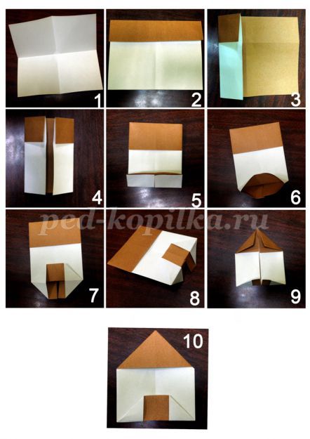 - Переверніть заготовку. Верхні кути опустіть до центральної лінії, сформувавши таким чином дах будинку (9).