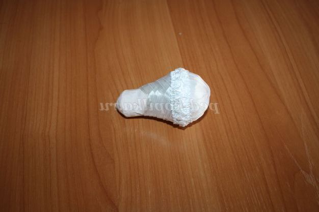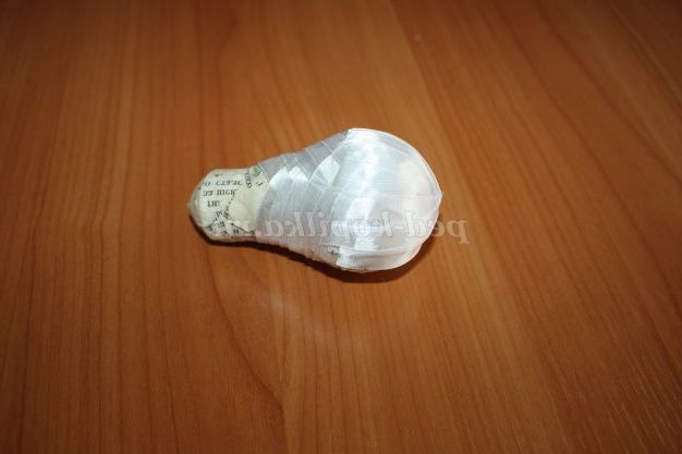 6. Нижню частину таким способом приклеювати дуже важко, тому натягуємо стрічку від середини до центру нижній частині лампочки.