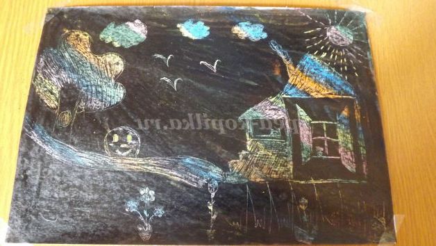 Після того,як гуаш просохне починаємо процарапывать малюнок. Включаємо свою уяву і відпускаємо у вільний політ свою фантазію.