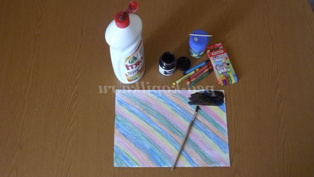 Потім змішуємо чорну гуаш і будь миючий средство.Это потрібно для того,щоб фарба більш рівномірно лягала на основу,зроблену восковими крейдою.