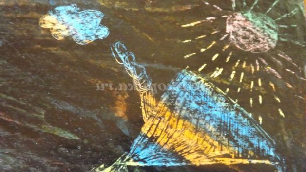 Лист має бути повністю зафарбований мелками.Не шкодуйте крейд:чим краще зафарбований лист,тим більш чітким і яскравим виходить малюнок.